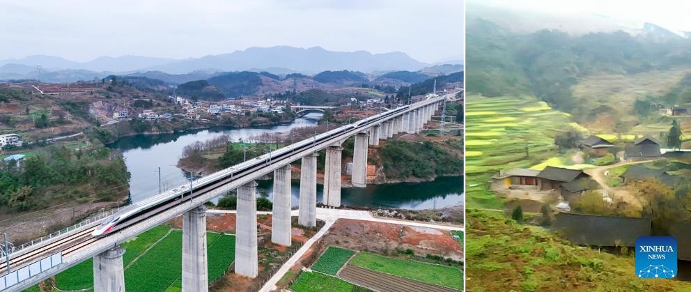 This combo photo shows a bullet train driven by Lu Jinsheng moving on a bridge of the Guiyang-Nanning high-speed railway in Duyun City on Feb. 8, 2025 (L, aerial drone photo taken by Long Jianrui) and the muddy paths in the past in Mingying Village in Duyun City (undated file photo), southwest China's Guizhou Province. (Xinhua)