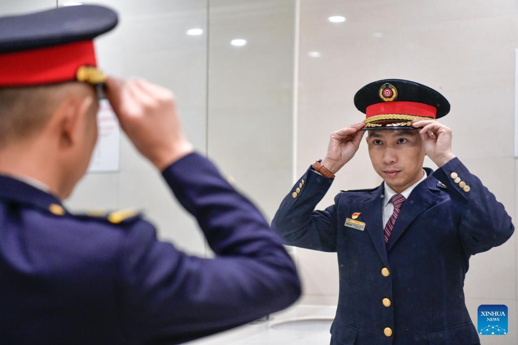 Lu Jinsheng adjusts his uniform before embarking on his duty at a bullet train workshop in Guiyang, southwest China's Guizhou Province, Feb. 7, 2025. (Xinhua/Yang Wenbin)