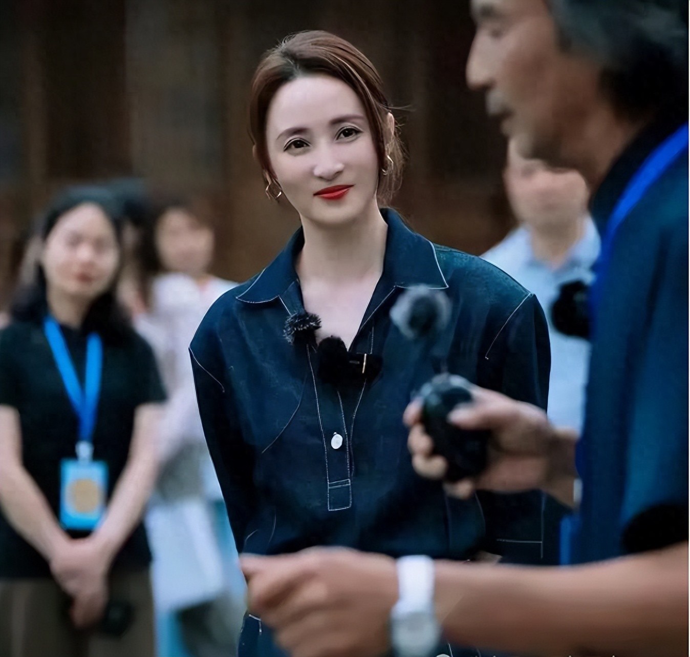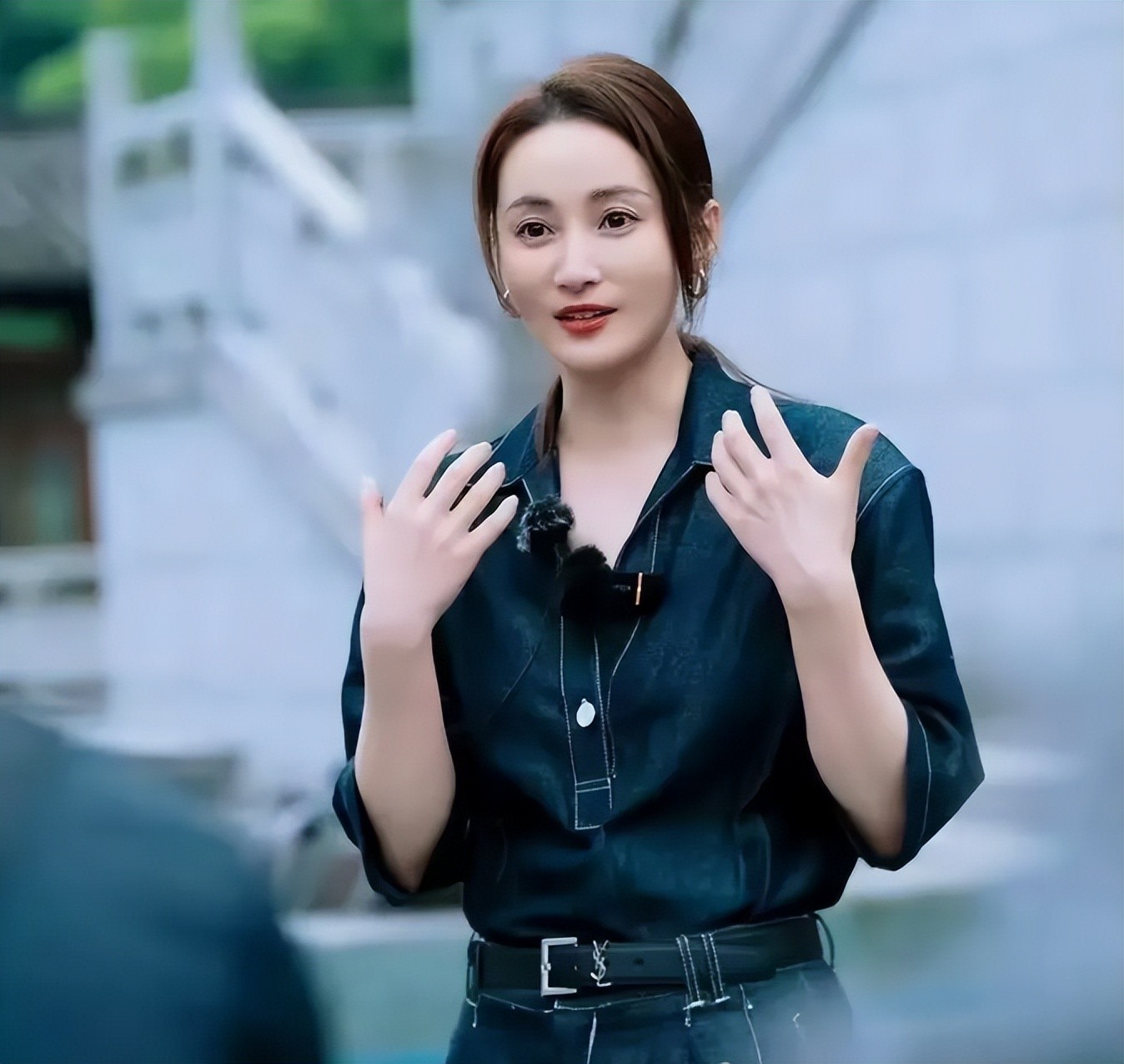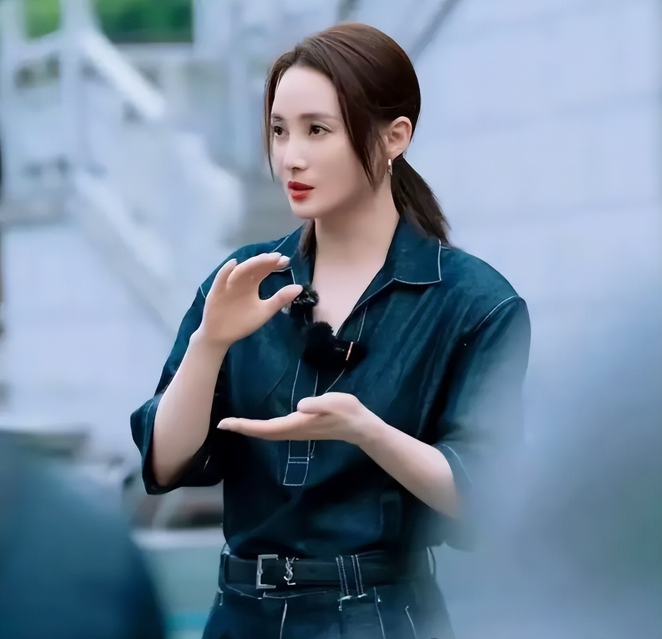 她身穿深蓝色牛仔连体衣,整体状态显得特别松弛。
