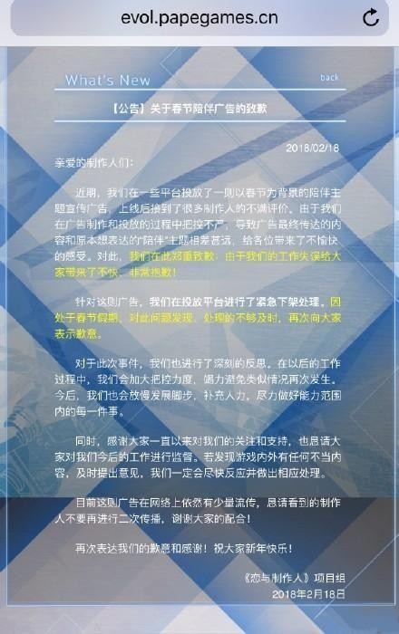 近期,我们在一些平台投放了一则以春节为背景的陪伴主题宣传广告,上线后接到了很多制作人的不满评价。由于我们在广告制作和投放的过程中把控不严,导致广告最终传达的内容和原本想表达的“陪伴”主题相差甚远,给各位带来了不愉快的感受。对此,我们在此郑重致歉:由于我们的工作失误给大家带来了不快,非常抱歉!