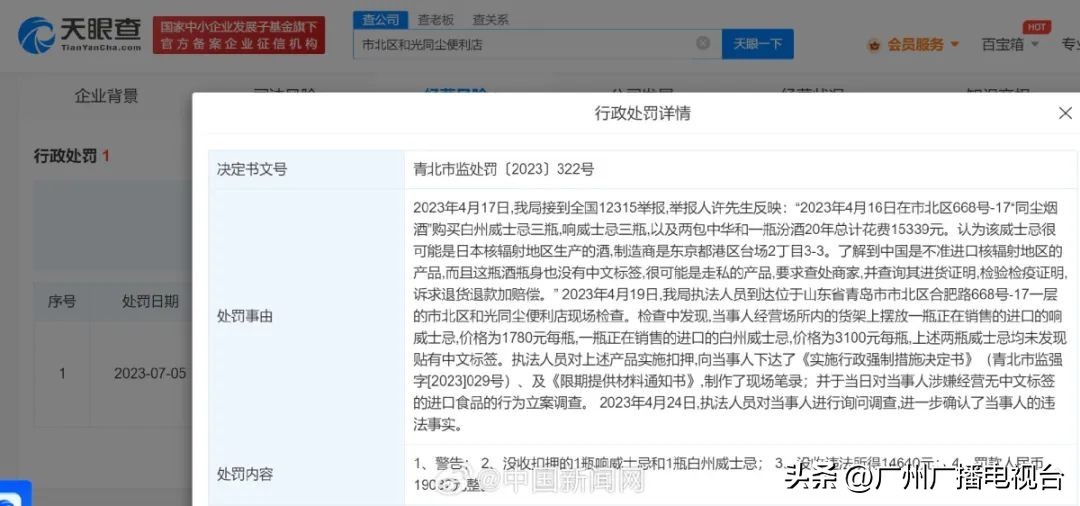 浙江购加兴新零售科技有限公司阳光西路分公司因经营来自日本核辐射区的多种食品被责令改正;佛山市顺德区汇洋行百货有限公司因销售采购产自日本长野县的饮料等被监管部门罚款1万,后被列入严重违法失信企业名单;成都神乐町餐饮有限公司因销售来自核辐射区日本福岛县的“大七酒”被罚款3万;青岛市市北区和光同尘便利店因涉嫌销售日本核辐射地区生产的威士忌酒被罚款1.9万余元。