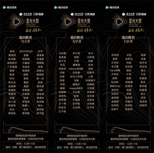 12月3日,2023腾讯视频星光大赏全阵容官宣完毕,超百位影、视、综、歌多栖明星将于12月17日齐聚中国澳门威尼斯人,共享星光闪耀、精品齐聚的年度文娱盛会。星光大赏是由腾讯视频主办的全平台超级盛典,为国内具有影响力的盛典品牌之一。本届星光大赏将集结众多拥有高口碑高热度作品的明星艺人,通过瞩目的荣誉颁发、精彩绝伦的舞台表演、群星荟聚的红毯环节,与观众共同回顾全年高光时刻,共启未来闪耀星途。