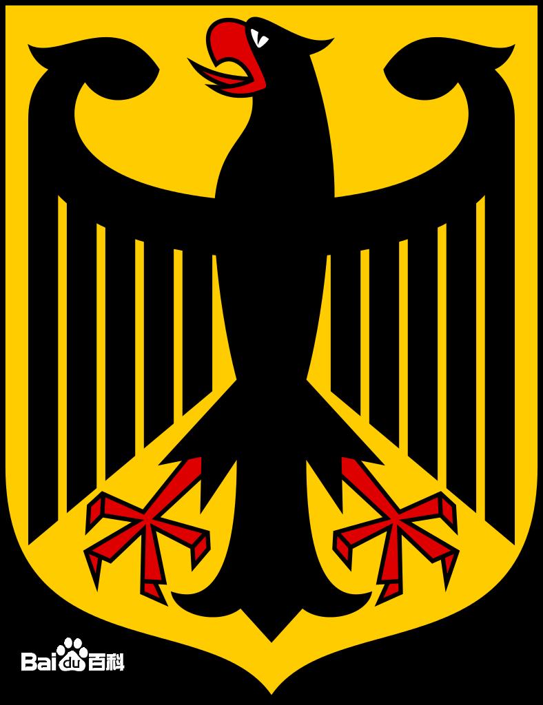 国徽:德国国徽为金黄色的盾徽,盾面绘有一只红爪红嘴、双翼展开的老鹰,称为“联邦之鹰”(德语:Bundesadler;昔日称为“Reichsadler”,意为“帝国之鹰”),黑鹰象征着力量和勇气,并与国旗的三种颜色相互辉映。此国徽重新使用了魏玛共和国的国徽设计 (1919 - 1935) ,于1950年被德意志联邦共和国政府采用。现行版本是1928年的设计,设计者是托比亚斯·施瓦布 (1887–1967)。现行国徽亦于1990圣诞节前成为了两德统一后的德国新国徽。