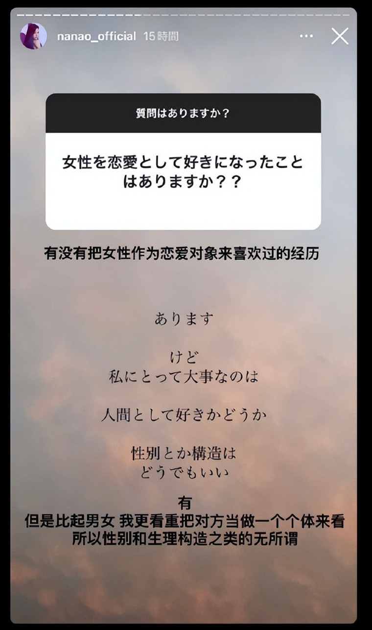 如今菜菜绪宣布自己是泛性恋,也让人对她的说法想入非非。其实,在日本当地,对于非异性恋的恋爱模式,包容度还是没有那么高的,从这一点上,大家也是很钦佩她能够说出自己的内心话,这需要很大的勇气,在一般人都是做不出来的。
