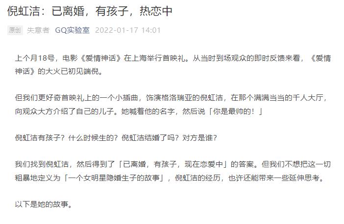 人红是非多,倪虹洁的感情生活又再次引发关注,1月17日《CQ》杂志发布最新的采访内容,倪虹洁亲述感情生活:“已离婚,有孩子,热恋中”