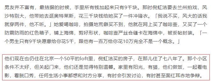 倪虹洁表示现在已经交了新男友,两人住在北京的50平米公寓,这套房子是倪虹洁名下最大的财产,虽然圈内的男友还没有成名,最穷的时候身上只有九千,但他愿意陪伴和付出,两人还养了1只狗、5只猫,日子过得非常惬意。