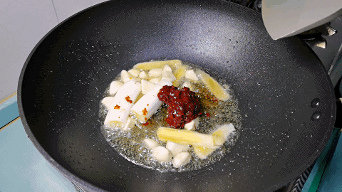 4.炒锅内加入少许植物油,先下入葱姜蒜爆香,再加入5克豆瓣酱划开炒散,炒出豆瓣酱的红油。