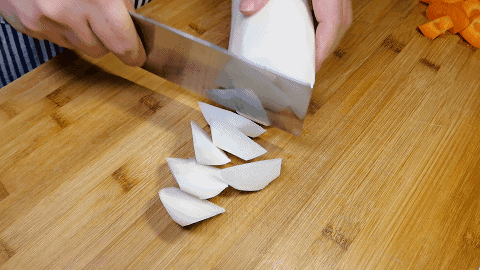 7.趁这个时间准备白萝卜和胡萝卜,去皮后切成滚刀块备用。