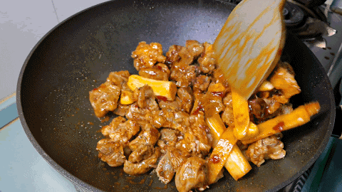 5.下入焯水后的羊肉,翻炒1分钟左右,炒出羊肉中的水气,把羊肉炒香。