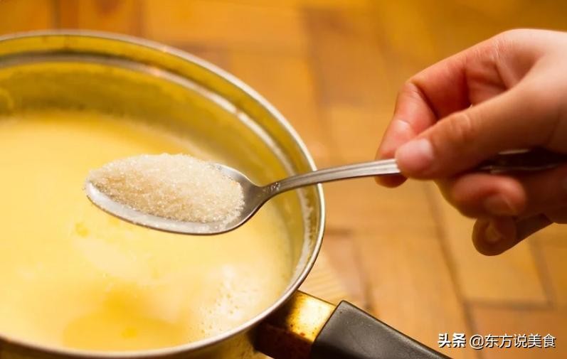 3、加入豆蔻粉、白糖和炼乳,轻轻搅拌至融化混合。