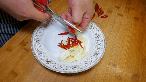 4.大蒜几粒切成蒜片,根据自己的口味剪一些红辣椒,辣椒要用清水浸泡一会,表皮浸湿后不容易炒糊。