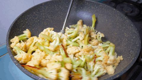 7.花菜炒至稍软后加入1克白糖提鲜、1克食盐调味,再淋入5克蒸鱼豉油。