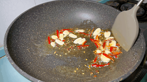 5.炒锅烧热淋入适量植物油,油面冒烟时下入蒜片、花椒、红辣椒爆香。