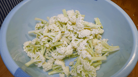 2.把切好的花菜放入盆中倒入清水,加入2克食盐抓洗片刻,要是时间充足,可以把花菜整颗放入淡盐水中浸泡10分钟,这样可以去除虫软和杂质,食用更放心。