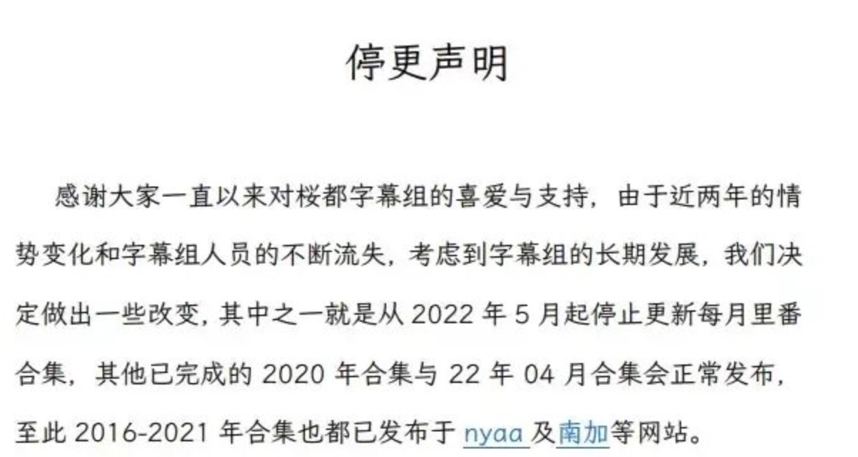 2022年五月,桜都字幕组官方发布声明,由于近两年的情况变化和人员流失,将于5月停止更新某些动画的合集,未来只更新普通番剧的内容。这一消息立刻震惊各大动漫群,顿时,动漫群友们哀声一片……