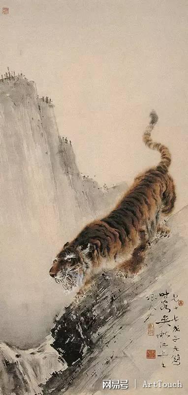 近代以来的中国画家中,画虎名家很多,例如张大千、何香凝、冯大中等。岭南画派创始人之一高剑父有不少画虎的作品,作于1918年的《猛虎》描绘的是一只下山之虎。画家不仅注意到尖利的虎牙和虎爪,而且也很强调虎在下山过程中的动势,仿佛要在那一瞬间就要把一扑、一掀、一剪的三大招式尽数施展出来。下山跳涧,勇往直前,说的正是虎在这个状态的表现。高剑父在《画虎笔记》中称其画虎“实开风气之先,其时囊金求画者踵相接”,丘逢甲也曾写诗称赞高剑父的虎:“画虎高于真虎价,千金一纸生风雷。”