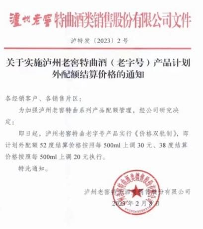 值得注意的是,2月初泸州老窖还被传特曲老字号产品实行价格双轨制,52度500ml计划外配结算价上调30元、38度500ml结算价按上调20元。