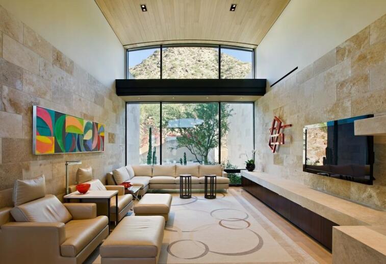 客厅面积比较大,大概有40平米左右,这个是个大别墅客厅,客厅沙发背景墙是采用瓷砖作为背景,瓷砖上挂了一副五颜六色的装饰画作为修饰,这种设计比较简单但是对于大别墅这种设计还是合适的