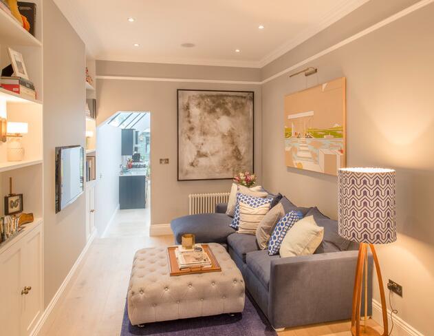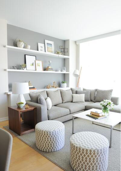 浅灰色的沙发背景墙上面设计了白色三层置物架,可以摆放一些装饰品,也摆放了一些画册,这个可以很好把装饰品和画册都利用起来,不再简单的挂一些画册了。