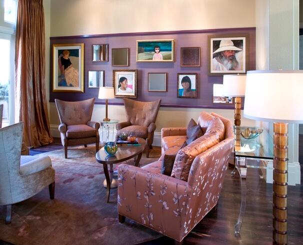 沙发背景墙整体色彩是紫色的,客厅的沙发也是淡淡紫色,客厅沙发和背景墙是协调统一的,这样的风格在欧美国家比较居多,沙发背景墙采用了多副人物相册挂画来装饰