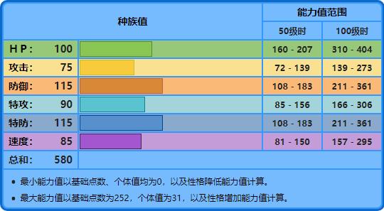 注:技能参照第七世代游戏技能表。技能里粗体字的招式为具有属性一致加成效果的招式。