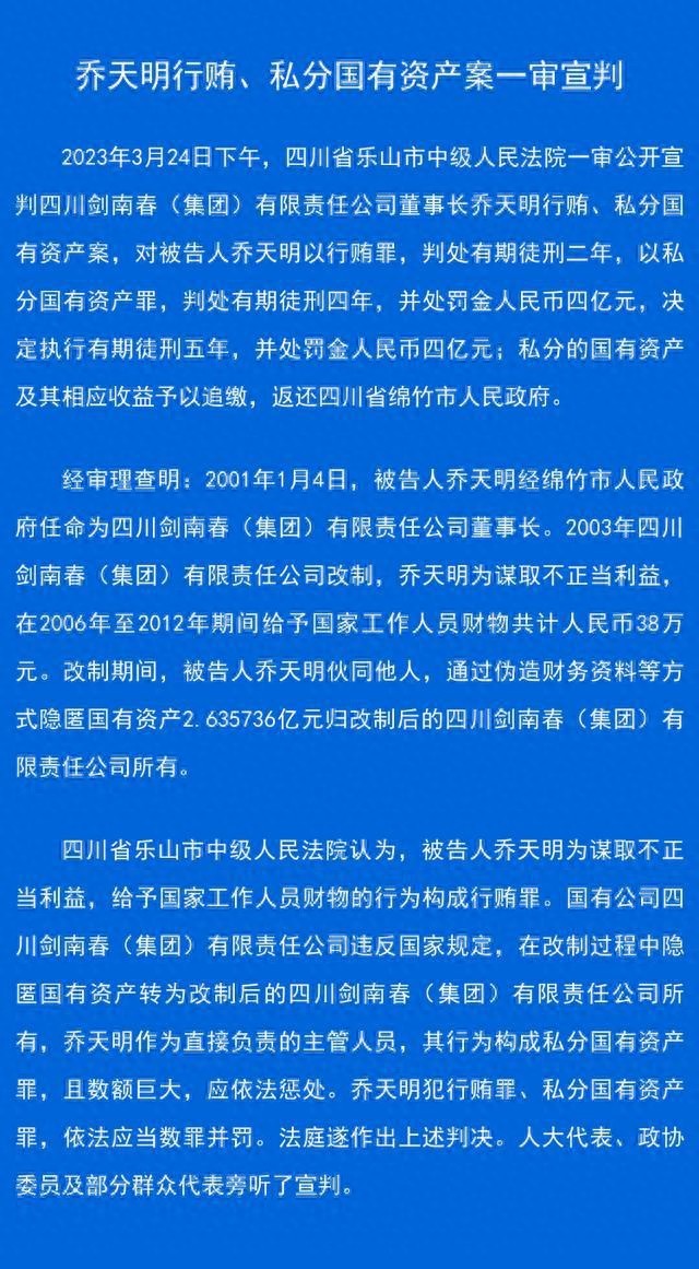 财联社3月24日电,据乐山市中级人民法院消息,今日下午,剑南春集团董事长乔天明行贿、私分国有资产案一审宣判。乔天明被判处有期徒刑5年,并处罚金4亿元。(财联社记者 朱万平)