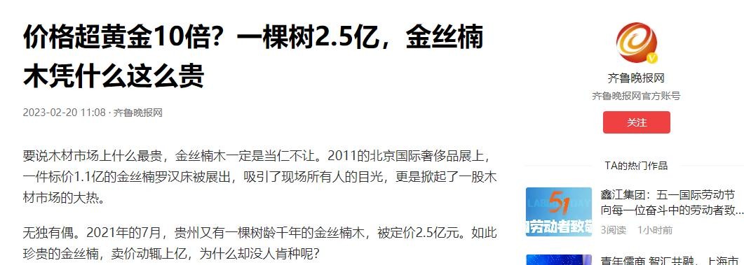 在收藏界,金丝楠木早已成为"价比黄金"的代名词。一根被风刮断的树枝都能卖到40万,更别提完整的原木了。