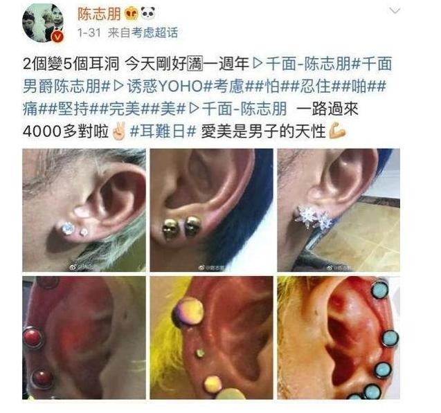 为了吸引观众的眼球,年近40的他在网上和网友分享自己打的耳洞,向网友分享自己有4000多对耳钉。