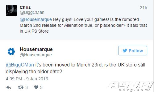 PS4独占作品《异化|Alienation》新的发售日期是2016年3月23日,官方Twitter账号昨天发布消息得以确认。