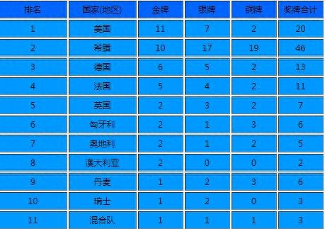 第一届奥运会,最大受益者居然是美国,虽然参赛人员少,但是奖牌榜居然在那个时期就已经开始雄霸。东道主希腊奖牌榜位居第二。