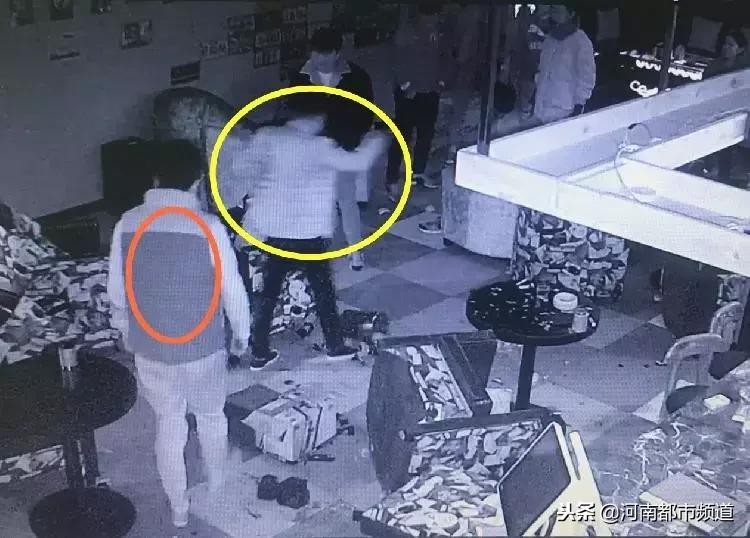 视频监控显示,李某(黄圈)在伸手拿烟灰缸(红圈),对面是王某(橙圈)。