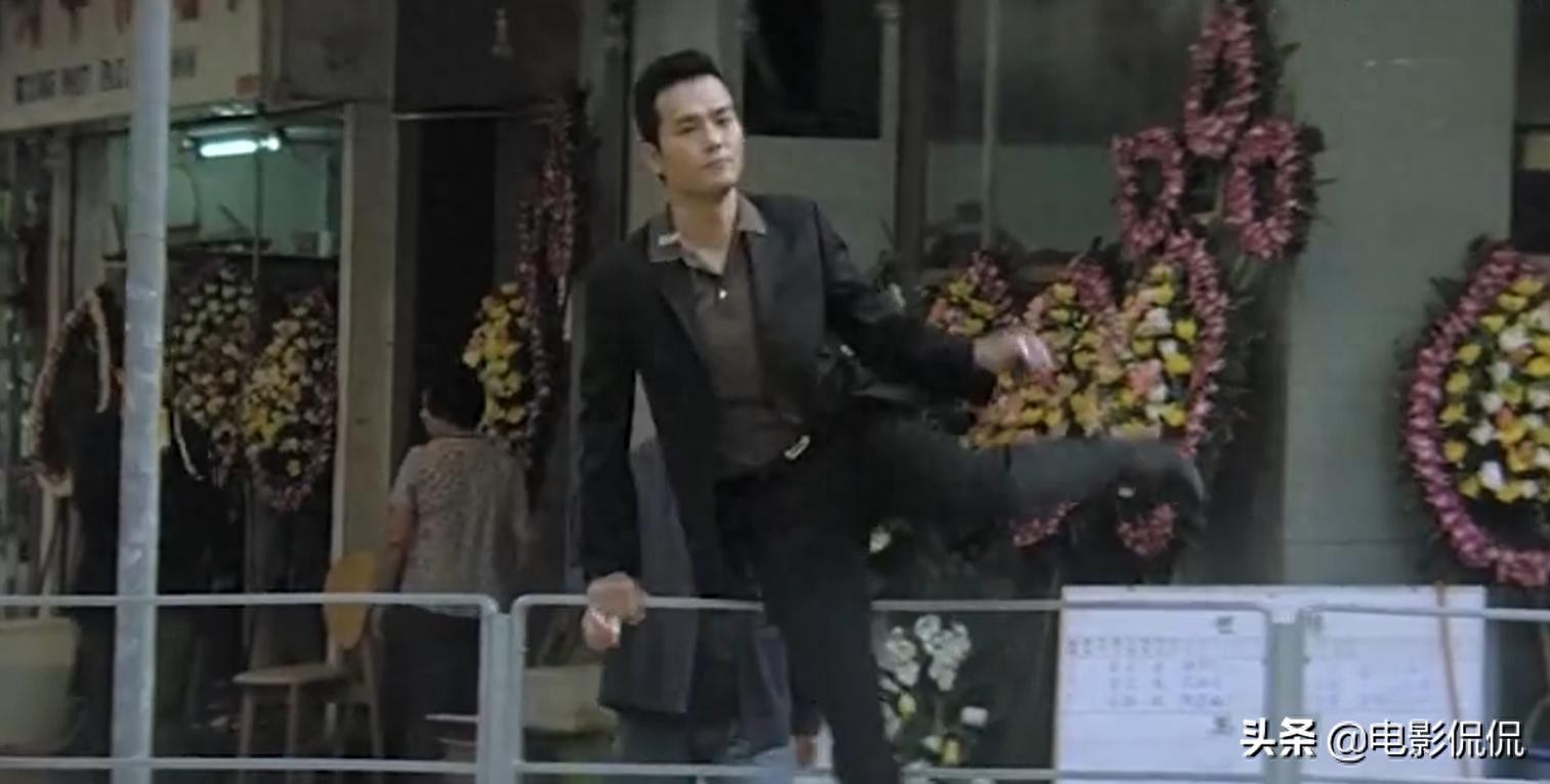 和林家栋这个跨栏动作类似的,可以对比梁家辉的《柔道龙虎榜》。他饰演的李亚冈是连续三届的柔道霸主,身手自然不错。所以我们可以看到,梁家辉翻越栏杆时西服一丝不苟,动作干净利落,眼神俾睨,令人莫测,更绝的是,他跨栏之后,解开了西服的扣子,这种小细节,反应了梁家辉深厚的演技。
