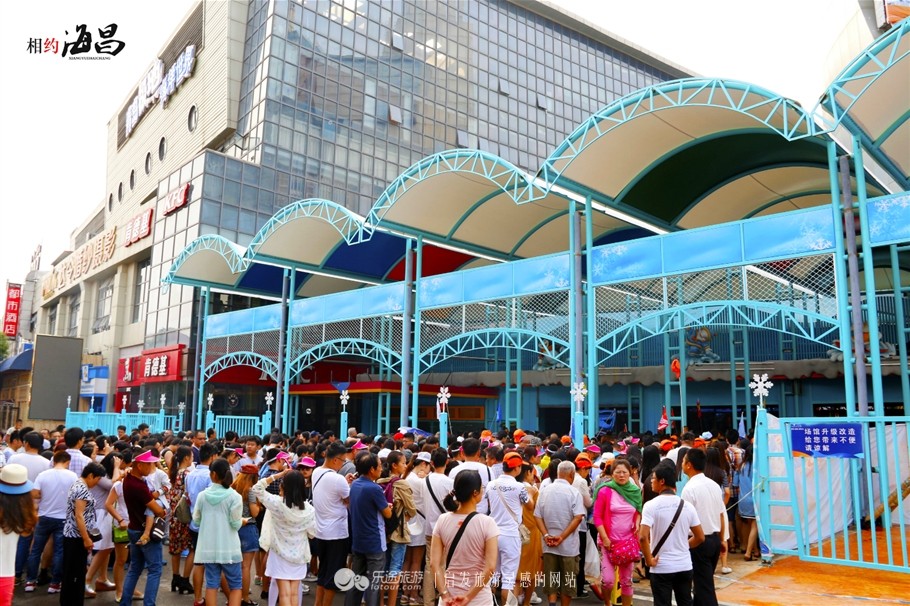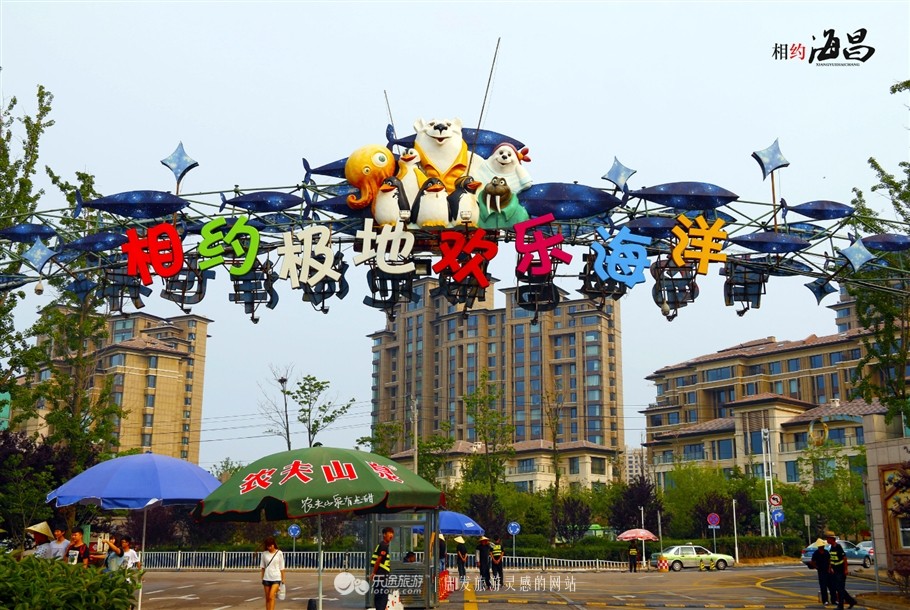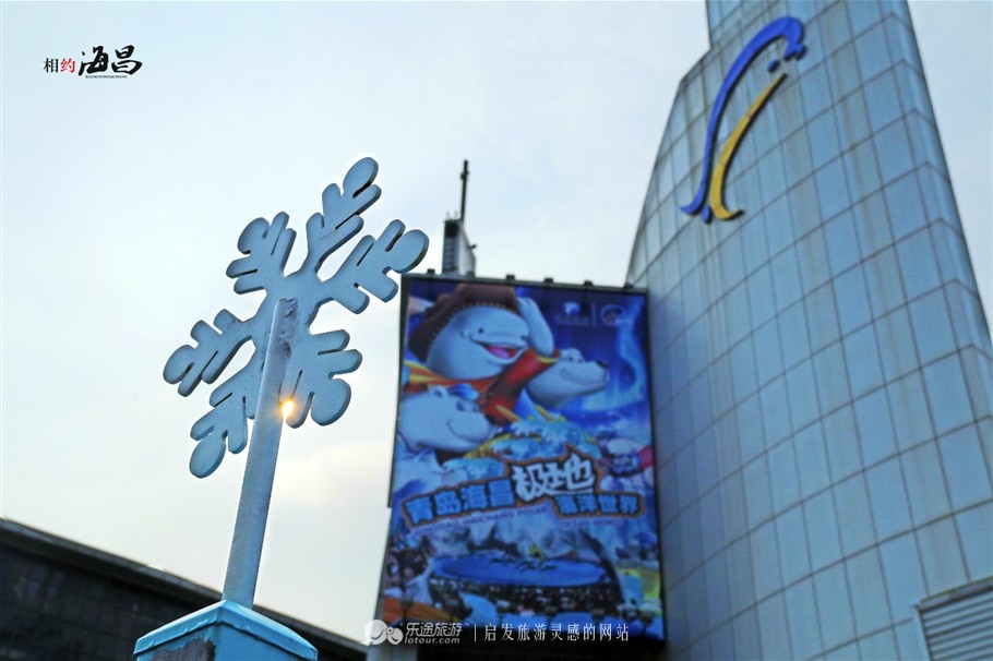 远远可见景区大门之上“青岛海昌极地海洋世界”几个五彩缤纷的大字,背面则是“相约极地欢乐海洋”,配合萌萌的企鹅和北极熊的卡通形象,十分引人注目。