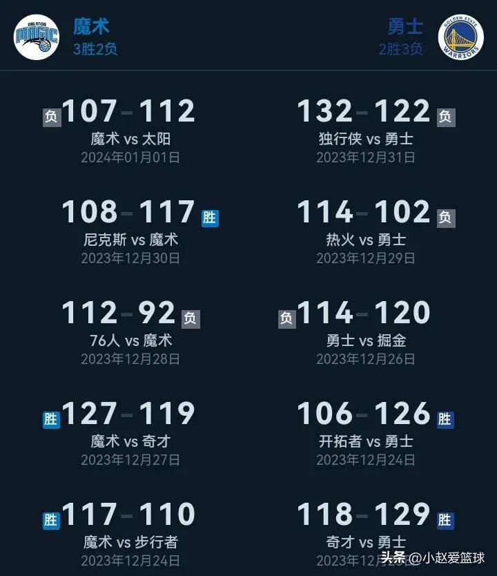 魔术最近状态很好,上场比赛输给太阳队,最近五场比赛他们取得了三胜两负的好成绩。反观勇士进五场比赛取得两胜三负,可以说状态不太在线。