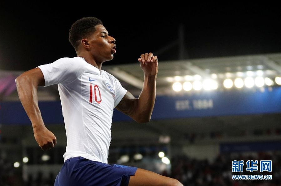9月11日,英格兰队球员拉什福德在比赛中庆祝进球。 当日,在英国莱斯特进行的一场国际足球友谊赛中,英格兰队主场以1比0战胜瑞士队。 新华社/路透