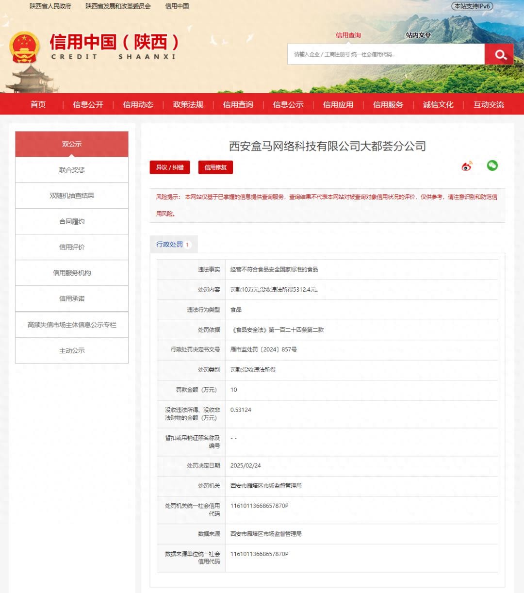 据行政处罚决定书(雁市监处罚〔2024〕857号)显示,西安盒马网络科技有限公司大都荟分公司存在经营不符合食品安全国家标准食品的违法行为,违反了《中华人民共和国食品安全法》第一百二十四条第二款之规定,被西安市雁塔区市场监督管理局依法处以罚款10万元,没收违法所得5312.4元。
