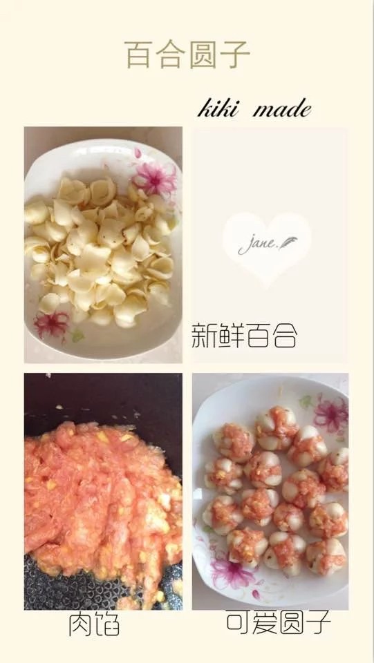 做法:肉沫打入鸡蛋,加盐调味备用,新鲜百合洗净,用百合一瓣一瓣的包裹肉沫,包成一个丸子,上锅蒸20分钟即可。