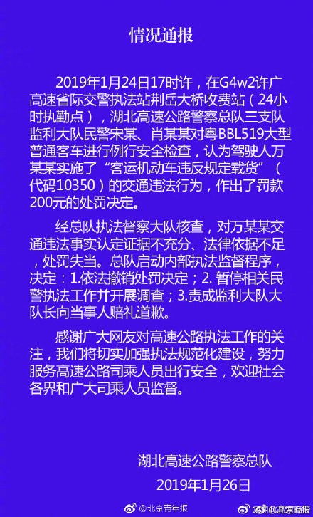 乘客带白菜萝卜上大巴被罚200元,官方通报:撤销处罚决定,暂停相关民警工作