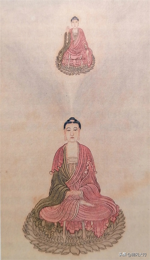 (注:佛教称在空间上有横三世佛,即中央释迦牟尼佛、东方药师佛、西方阿弥陀佛。此图中上下两佛像都是阿弥陀佛。上面的佛像,其手势,向下的手掌为“与愿印”,每当要帮助众生时,就结与愿印,向上的手掌为“无畏印”,可以喝退妖魔。下边的佛像,其手势是常见的“禅定印”。)