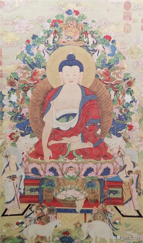 清代《释迦牟尼像》,下面站立的是大弟子迦叶和二弟子阿难。