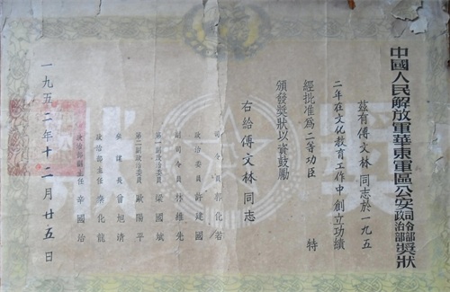 1952年12月,傅文林在担任公安部队文化教员表现突出荣立二等功。