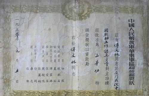 当年傅文林受聘为《公安部队杂志》通讯员,由他亲笔写的这篇报道,出于本人谦虚低调,文中略去他的名字及个人事迹。但因其只身擒匪事迹突出,受到华东军区、第三野战军司令部嘉奖,荣立一等功,当颁发的立功喜报送到他的老家张镇傅墩村时,乡亲们都为家乡出了个剿匪英雄而感到自豪。