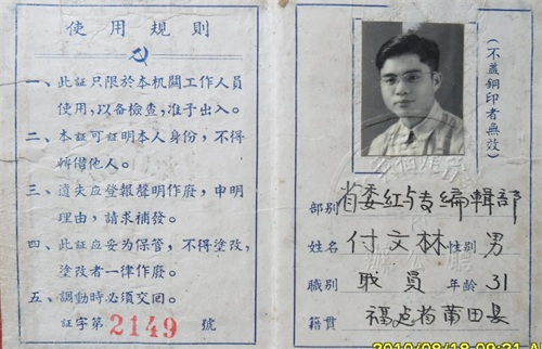 1957年,傅文林转业后调省委《红与专》(现《支部生活》)刊物任编辑
