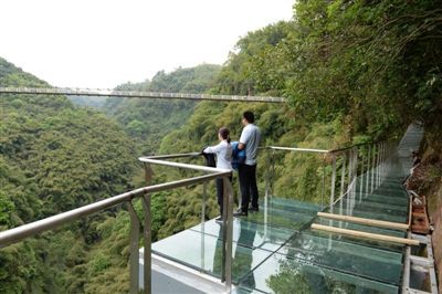 据川西竹海景区市场营销部经理李波介绍,景区内的玻璃栈道是成都首座玻璃栈道,起点位于景区内铁索桥“仙侣牧云桥”旁,全长260米,其中纯玻璃栈道的部分长约199米,而栈道的宽度为1.5米,垂直高度落差达到了100米,最高处落差约150米。