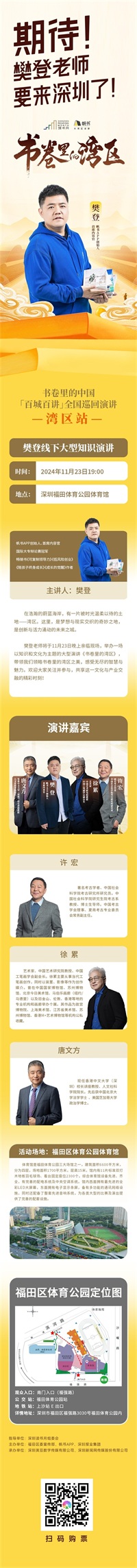 文化的闹钟,城市的雅集。11月2日,第二十五届深圳读书月正式启动。金秋鹏城,再次迎来一年一度的开卷之美、阅读之乐。回望历史文化变迁,描摹湾畔城市美学,直面时代科技巨变,感受人间烟火书香......作为本届读书月的重点品牌活动之一,11月23日,帆书创始人樊登将携手许宏、徐累、唐文方四位深港文化名人一起为湾区书友们带来“书卷里的湾区”主题演讲。