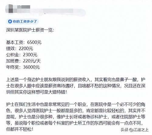 还有中肯的评价:护士这个职业,还有一个不可忽视好处:食宿,医院应该是免费提供的吧?。很多打工人每月的食宿会占据工资不低的比例。所以每月有这个收入,不低了。毕竟这个岗位不是高精尖或高管岗。