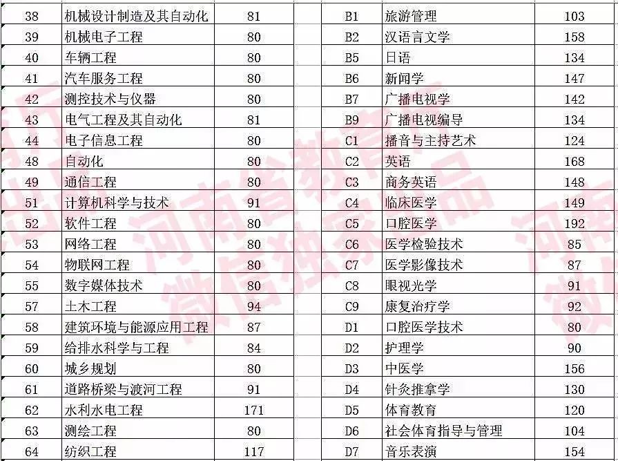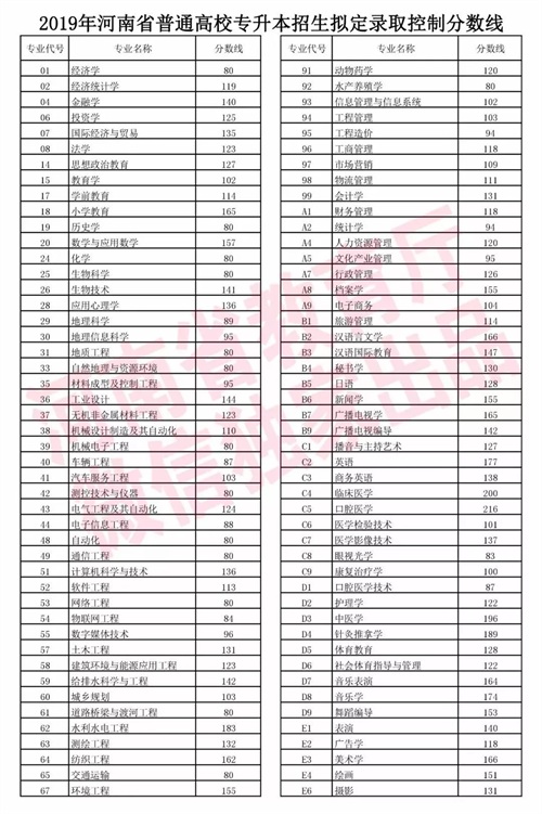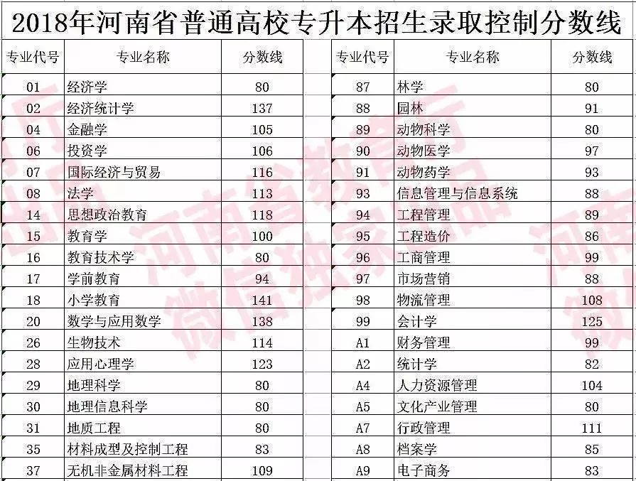 2018年河南省普通高校专升本招生录取控制分数线