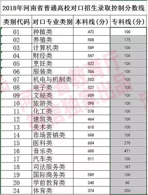 2018年河南省普通高校对口招生录取控制分数线