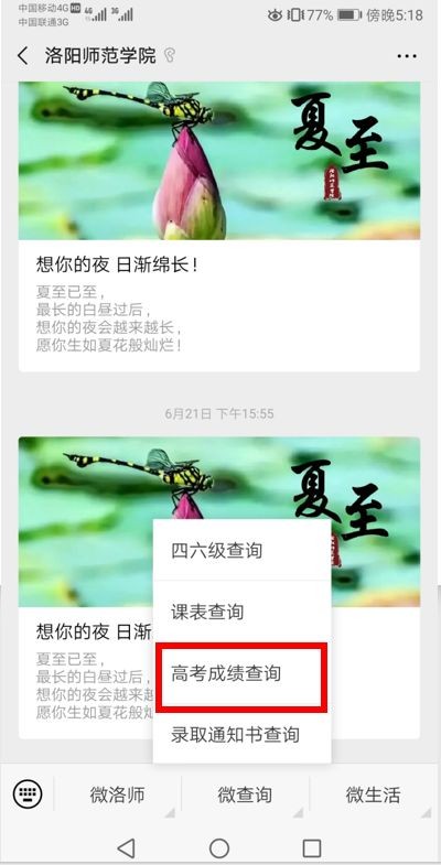 第二步:关注洛阳师范学院微信并进入对话界面点击预约查分