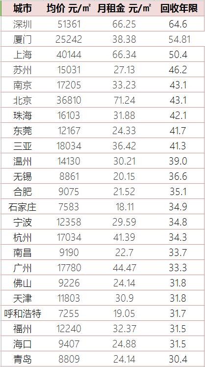 紧随深圳之后的是厦门,需要55多年才能回本。那时候,一个年轻小姑娘,也变成了广场舞跳舞的大妈了。